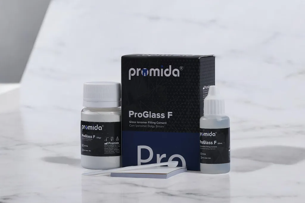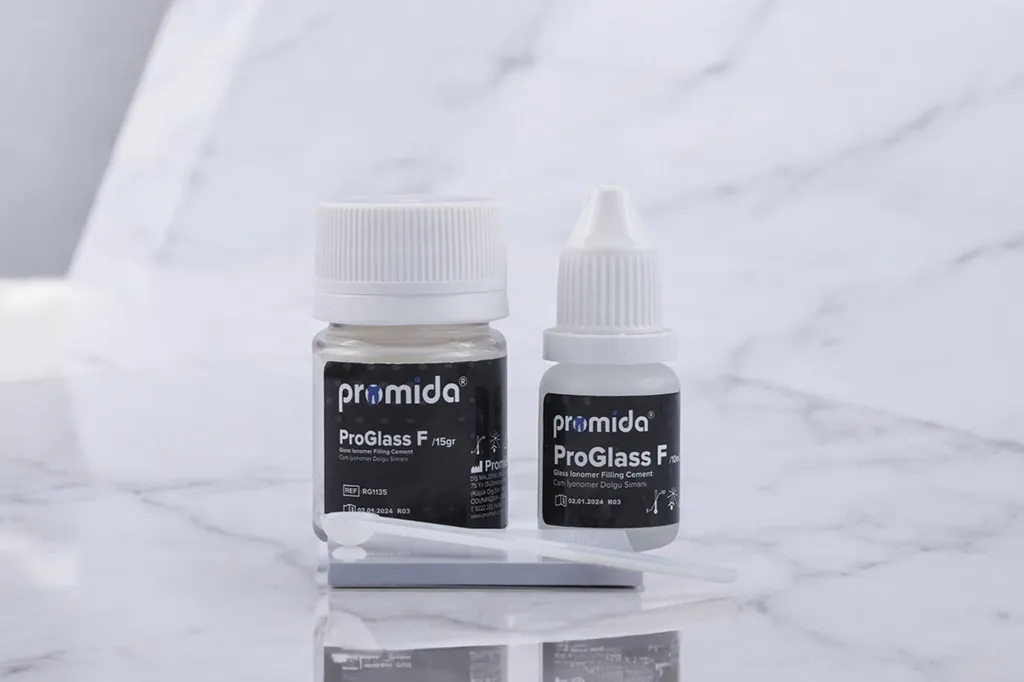 - PROGLASS F, toz ve likitten oluşan kimyasal olarak sertleşen bir cam iyonomer dolgu simanıdır.